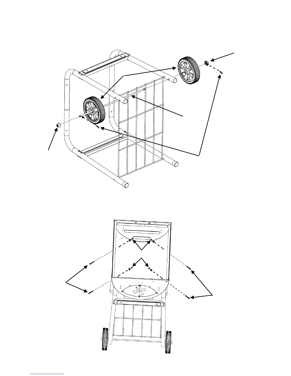 Step 3: Lay the cart assembly down with the Long Legs on the floor then install the Wheels and