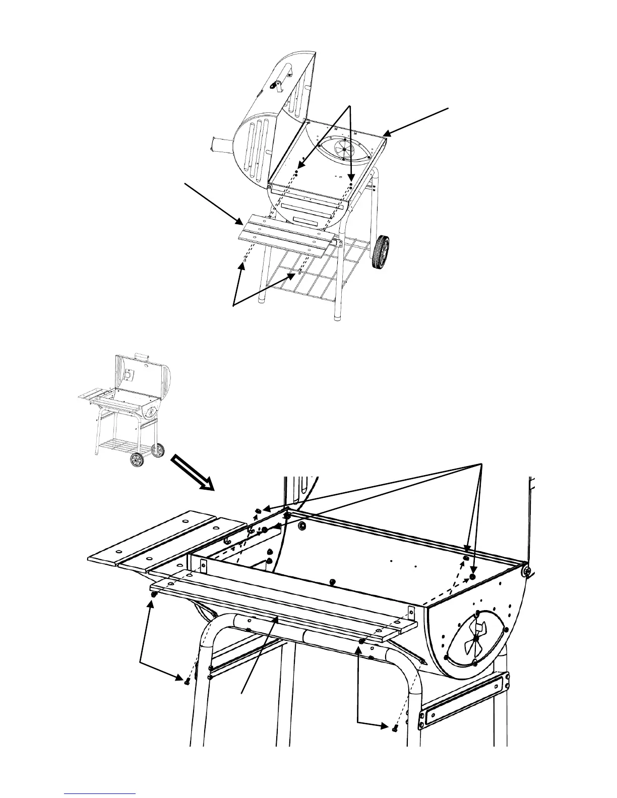 Step 10: Attach Front Shelf to Grill Body with four Hex Bolts and four (4) ¾” Hex Nuts.