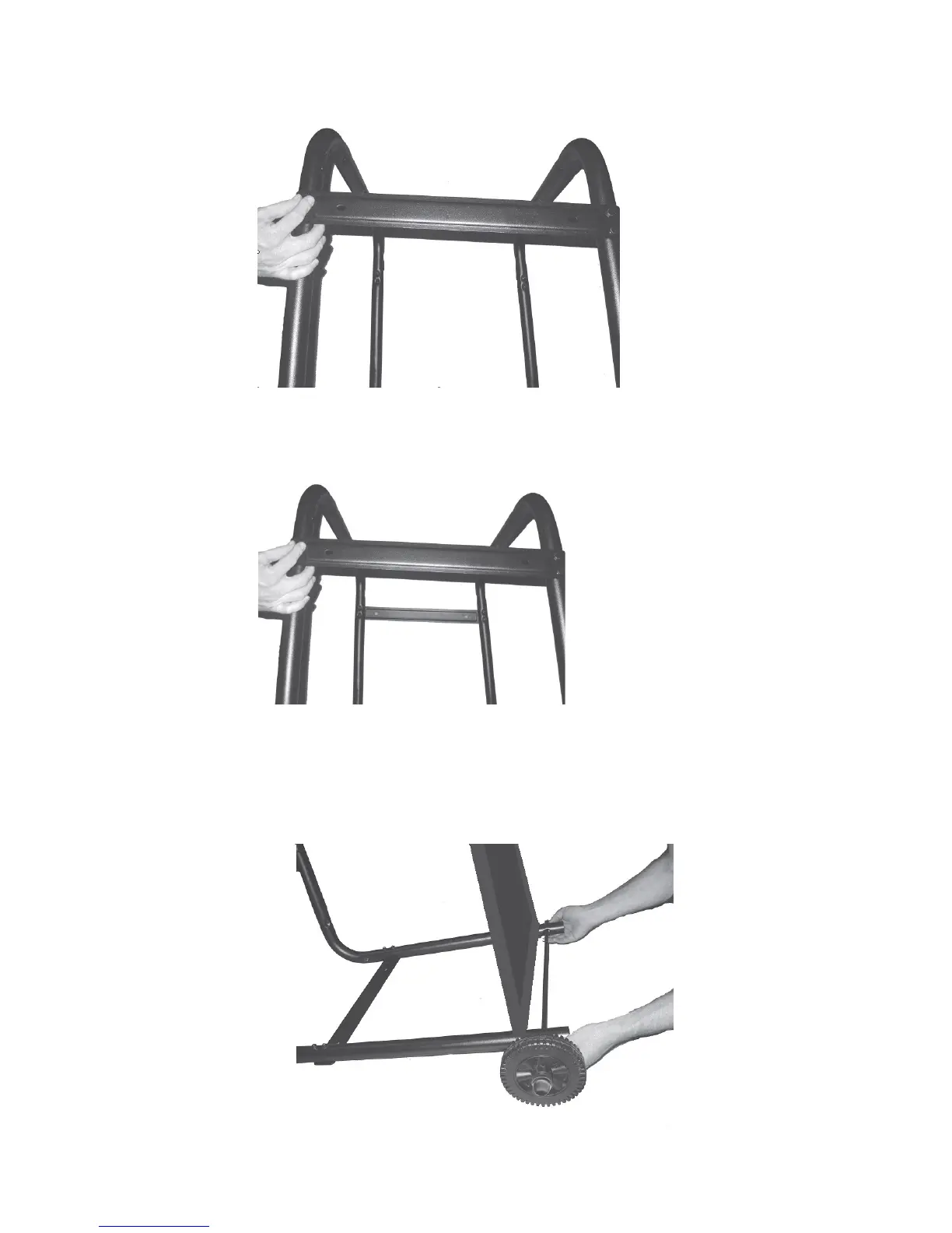 6. Insert the AXLE through the SHORT LEGS and through the BASE. Slide WHEELS