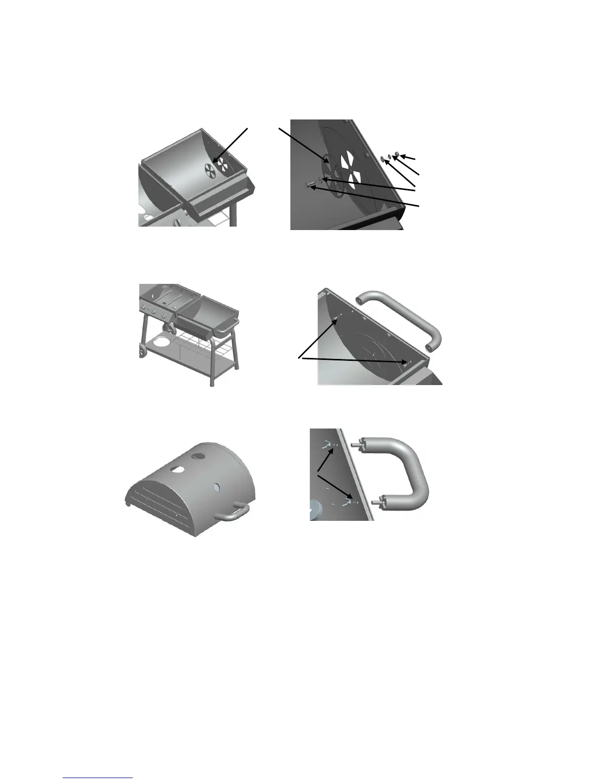 Attach the HOOD HANDLES to the GRILL HOODS with four (4) LOCK WASHERS and four