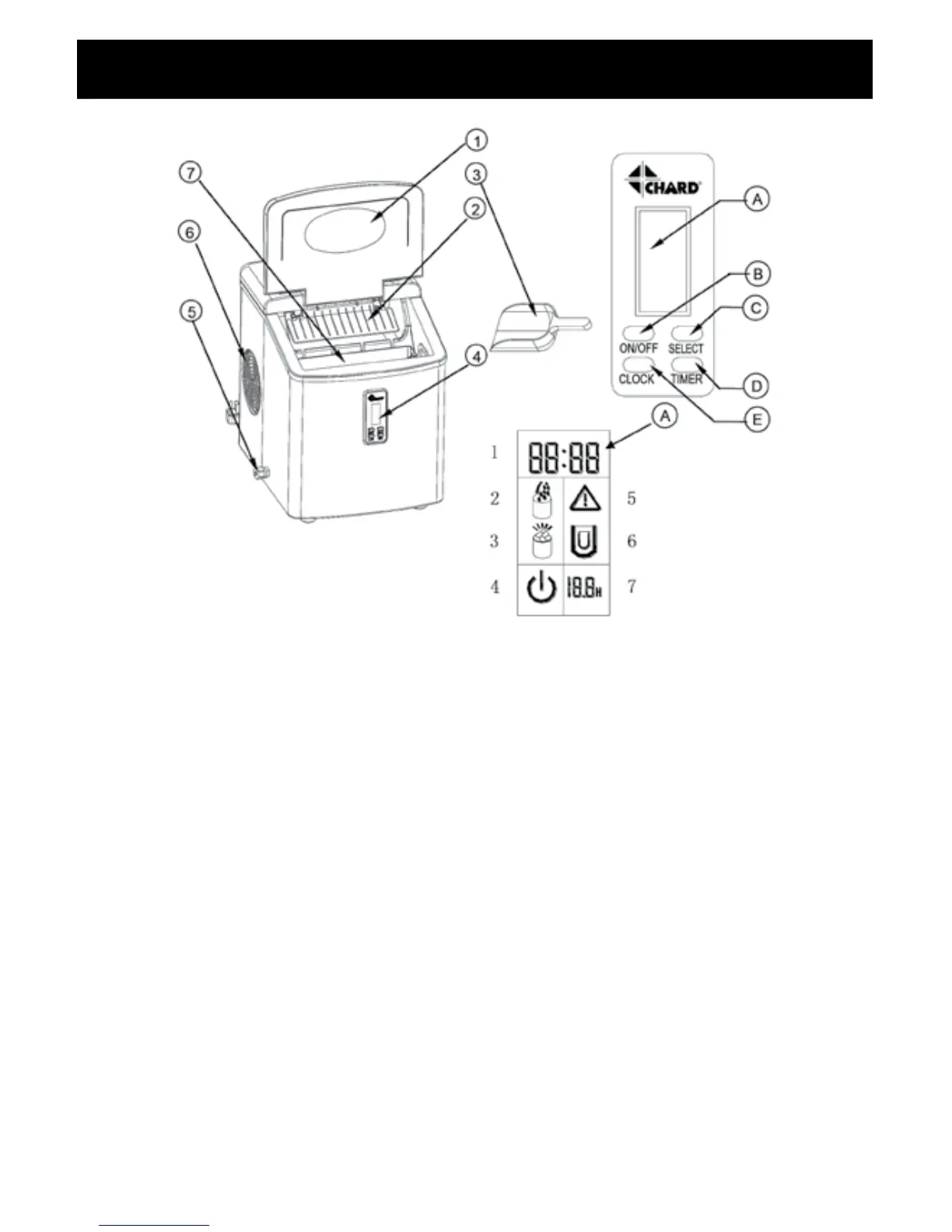 6. ICE-CUBE SIZE DISPLAY: To select ice cube size: Small, medium, and large.