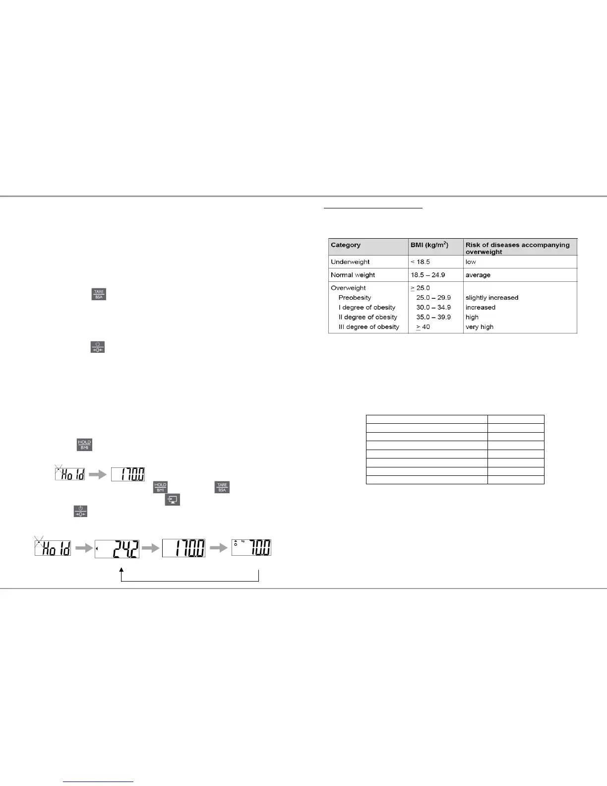 7. Display will show “HOLD” and lock weight to calculate BMI.