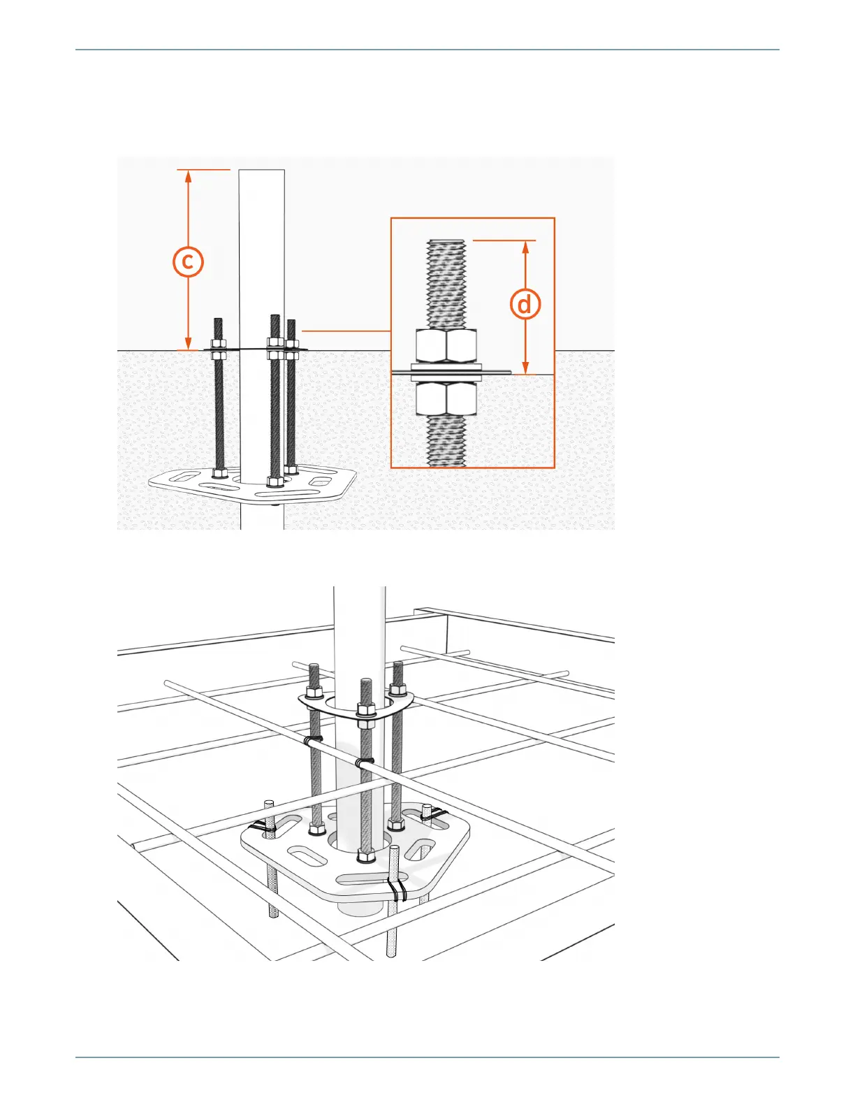 8. Conduit height (c) must be between 152 mm (6 in) and 590 (23-1/4 in). Each bolt (d) must extend