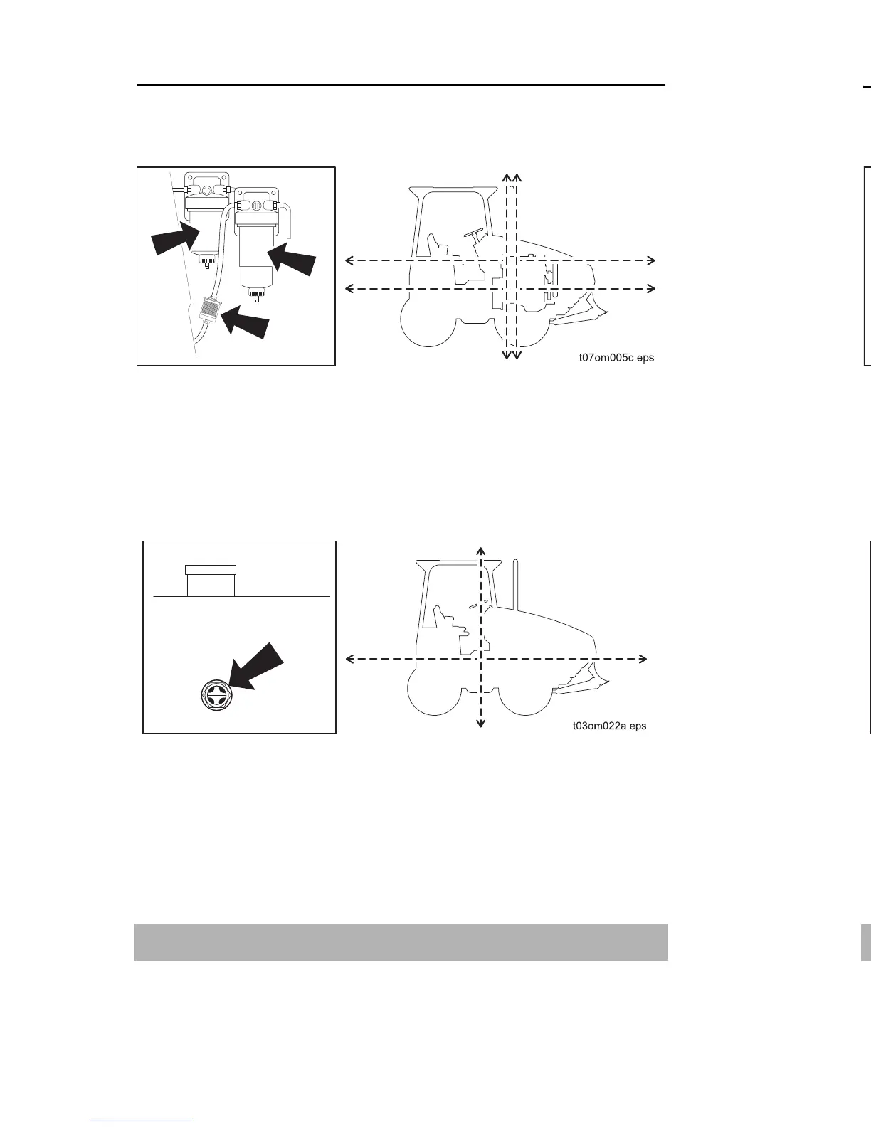 Check water separators (1) and fuel filters (2) every 10 hours.