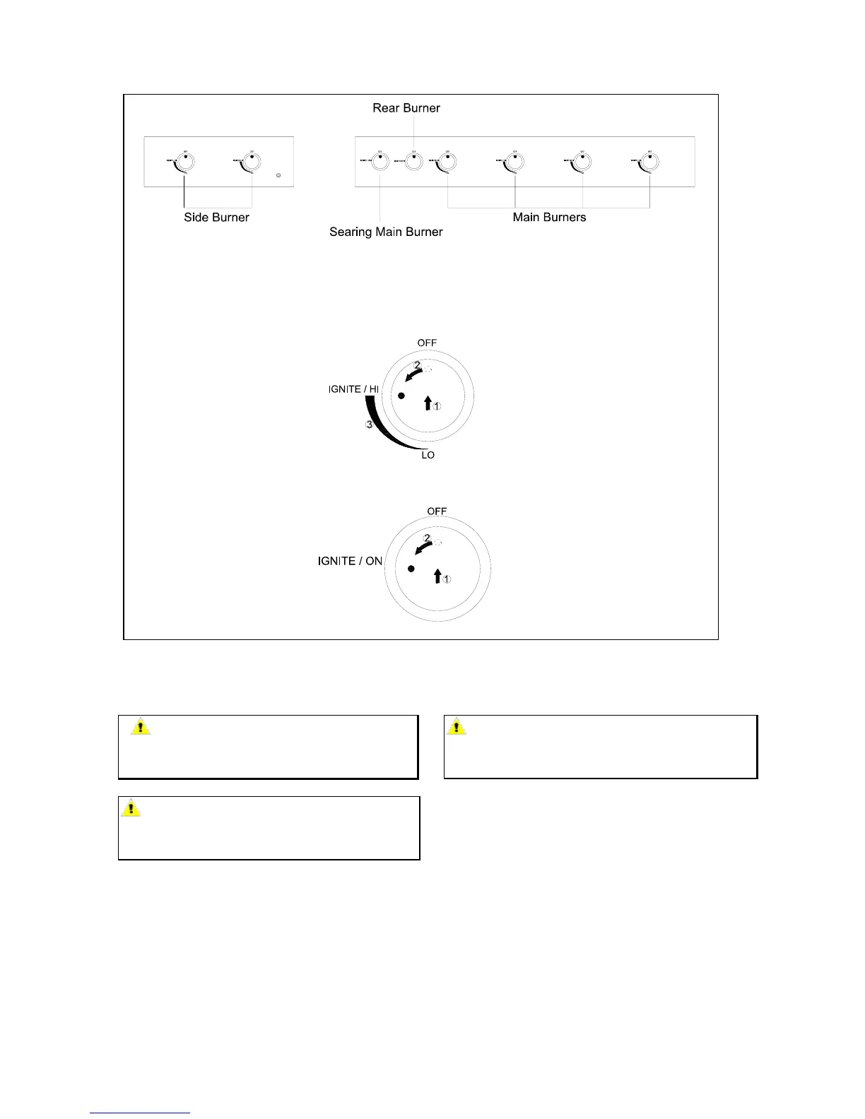3. Push and turn Main Burner knob slowly to IGNITE/HI, burner should light immediately.