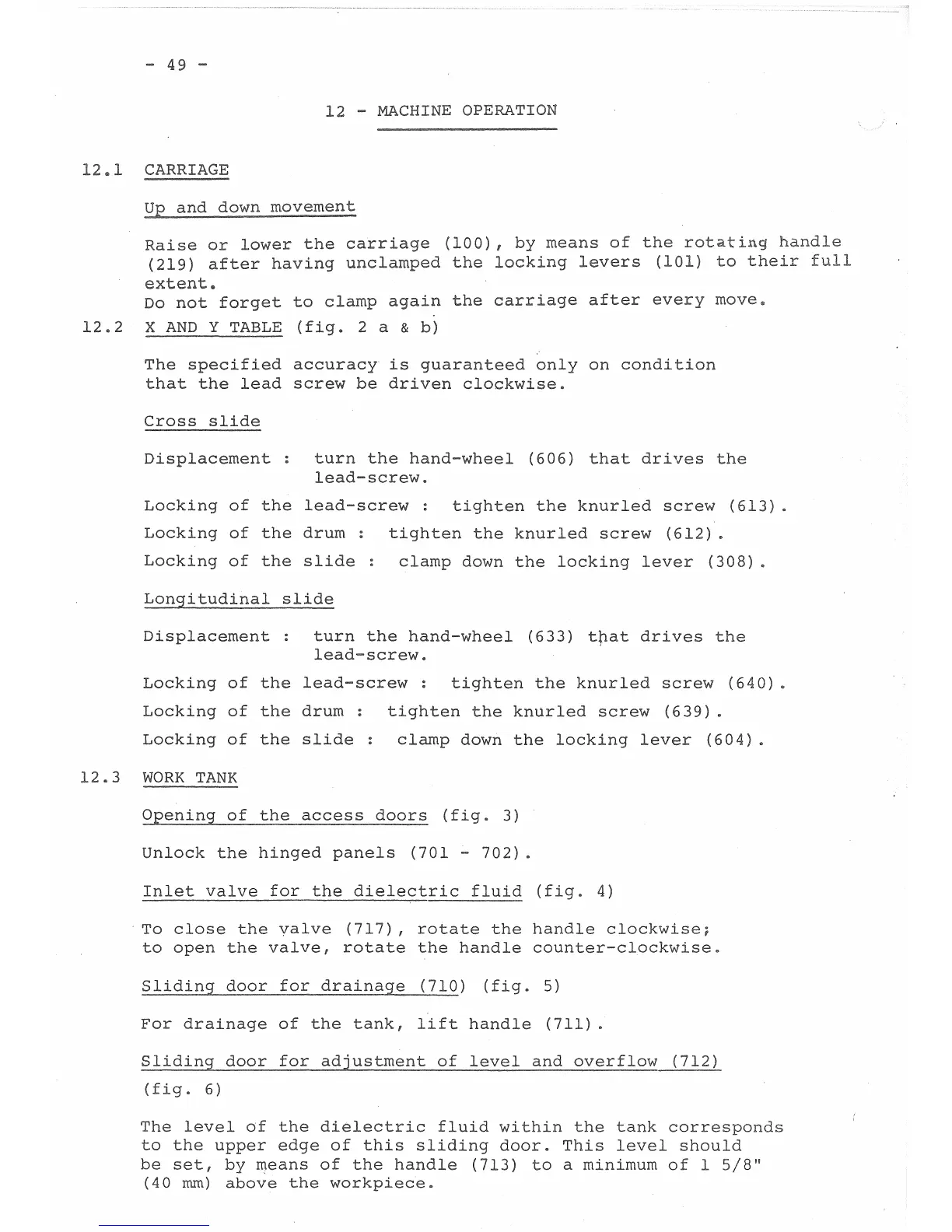 Charmilles E110-D10 - 12 - MACHINE OPERATION; 12.1 CARRIAGE OPERATION; 12.2 X AND Y TABLE OPERATION; 12.3 WORK TANK OPERATION