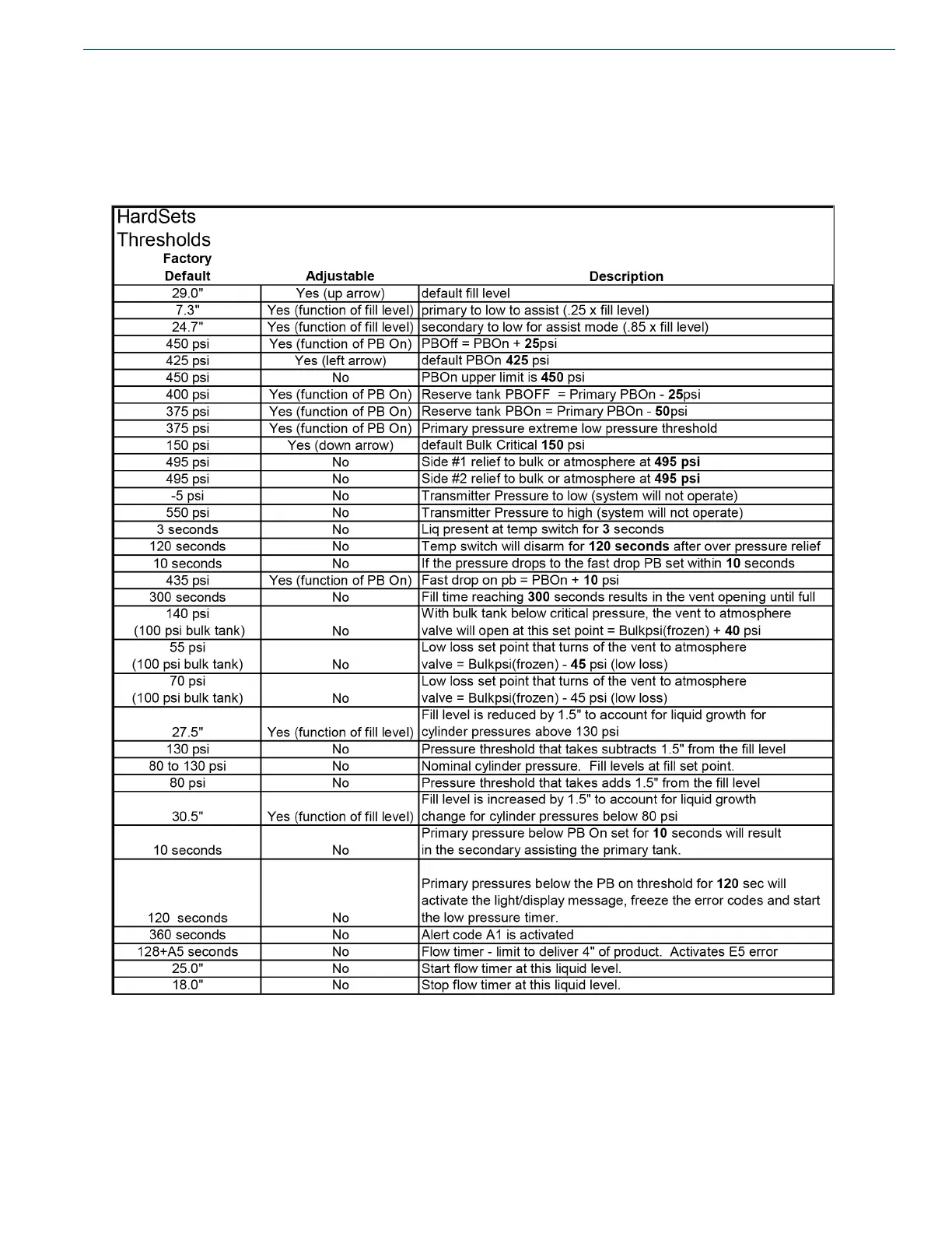 internal parameters. Hard sets vary slightly by product. The values in the table below are for nitrogen service.