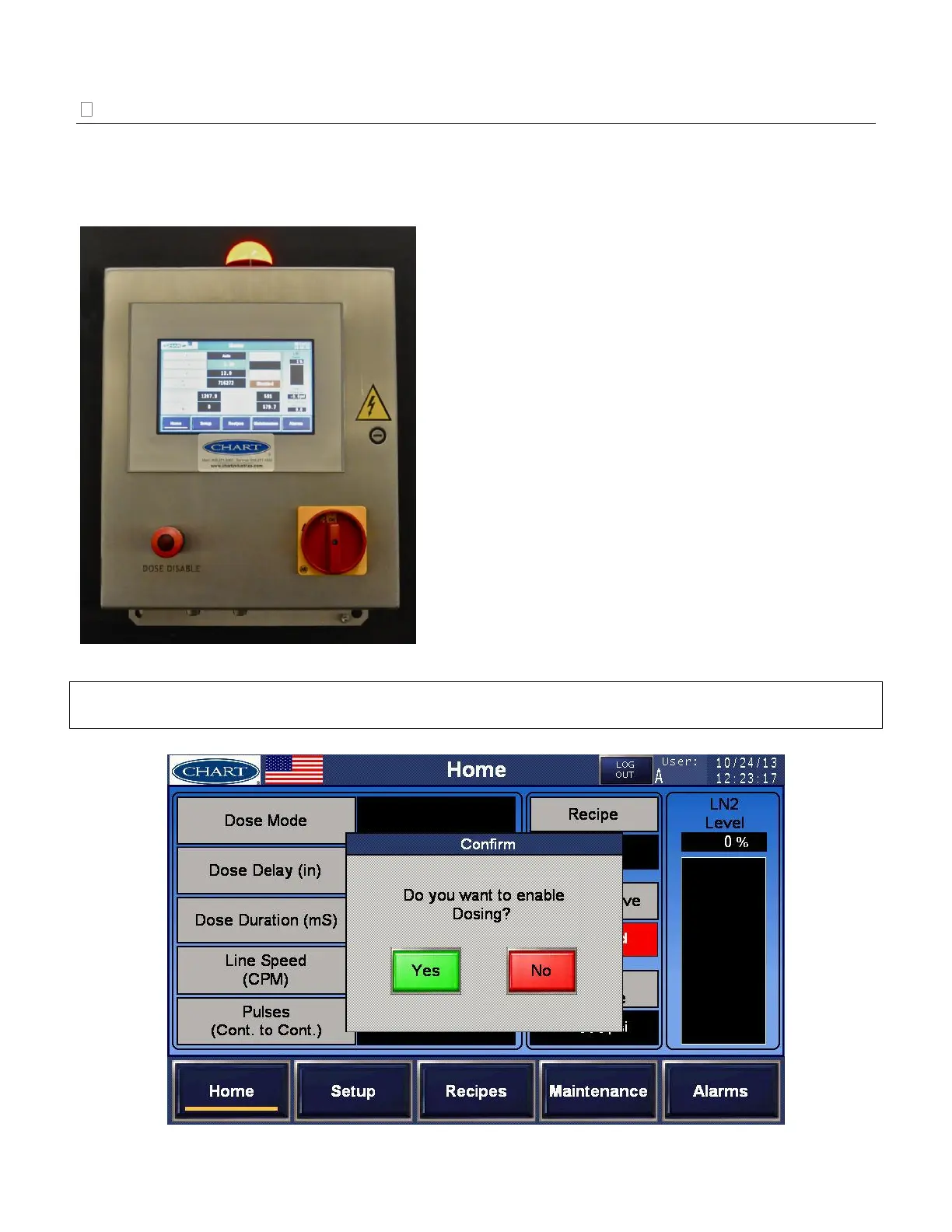IMPORTANT: Upon manual dose enabling via the push button, a pop up confirm window will display