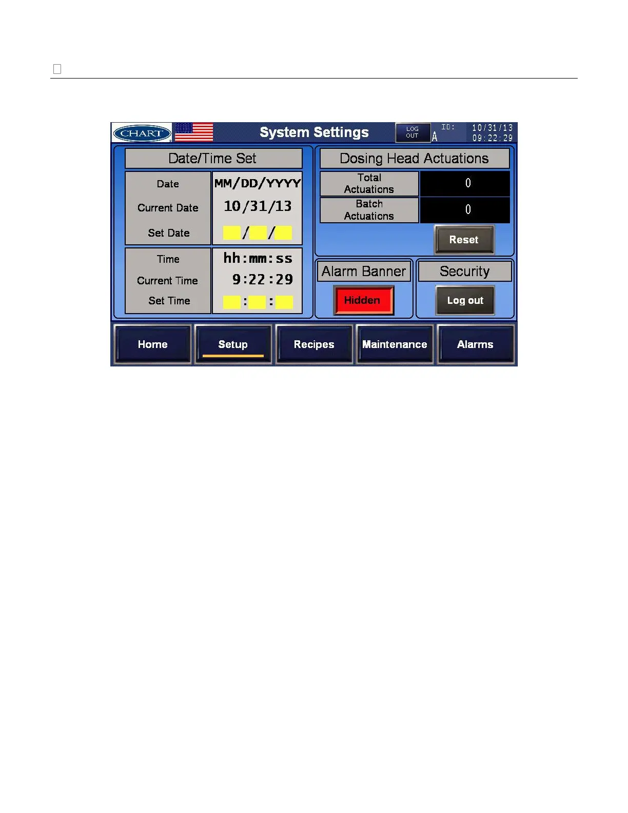 From [Setup], select [System Settings] to change system settings such as date/time, reset batch actuations,