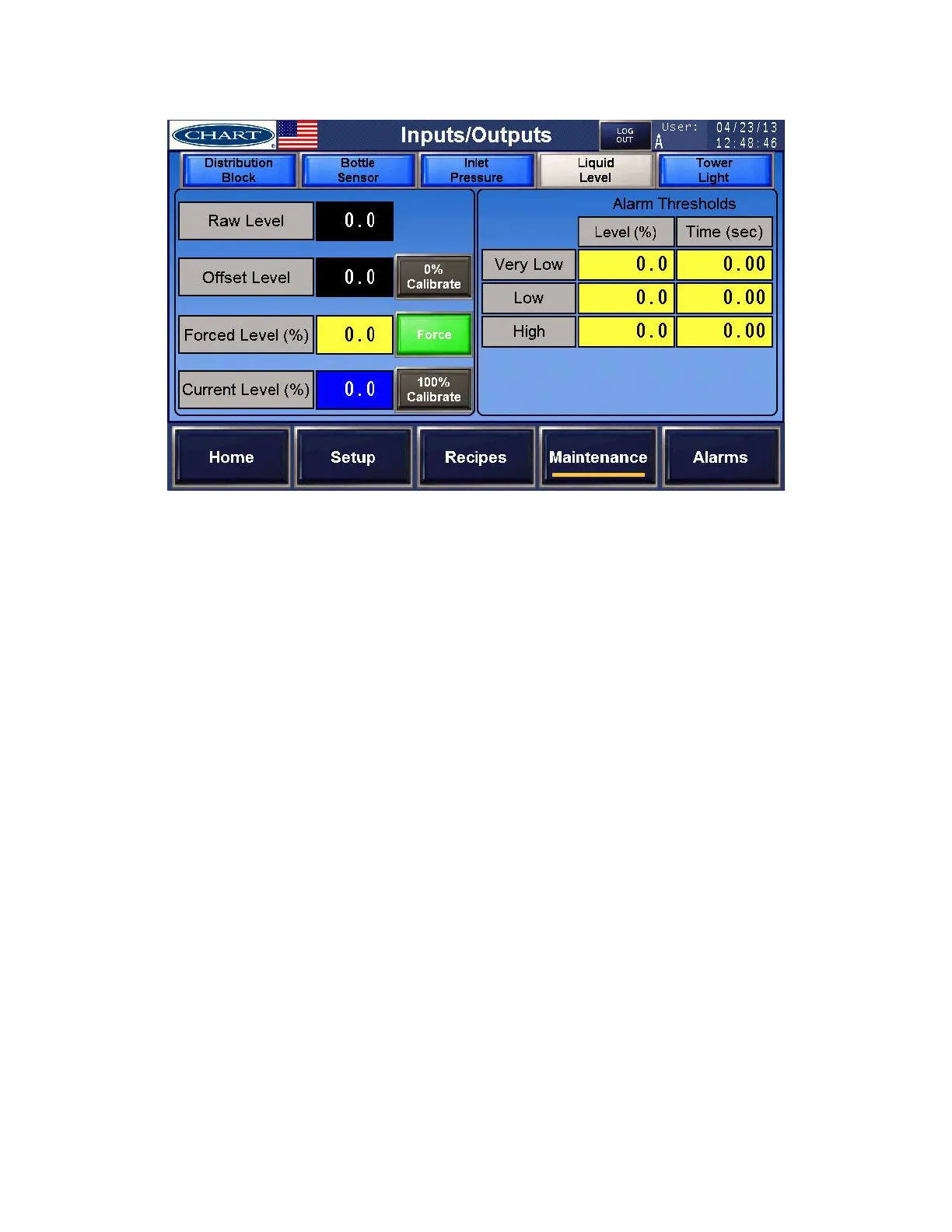 Liquid Level – calibrate and set alarm threshold for Liquid Level