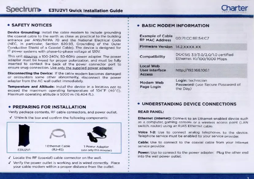 Charter Spectrum E31U2V1 - Safety Notices; Device Grounding; Preparing for Installation; Verify Package Contents