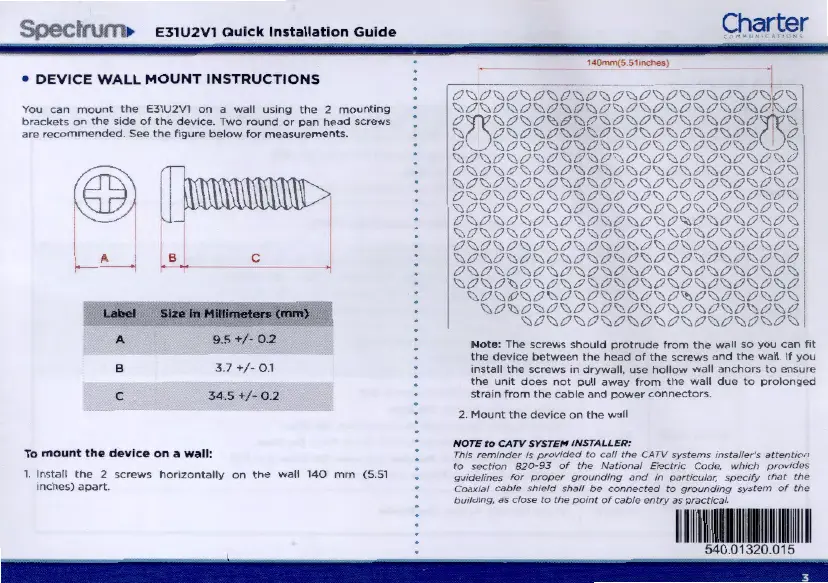 Charter Spectrum E31U2V1 - Device Wall Mount Instructions; Screw Specifications for Mounting