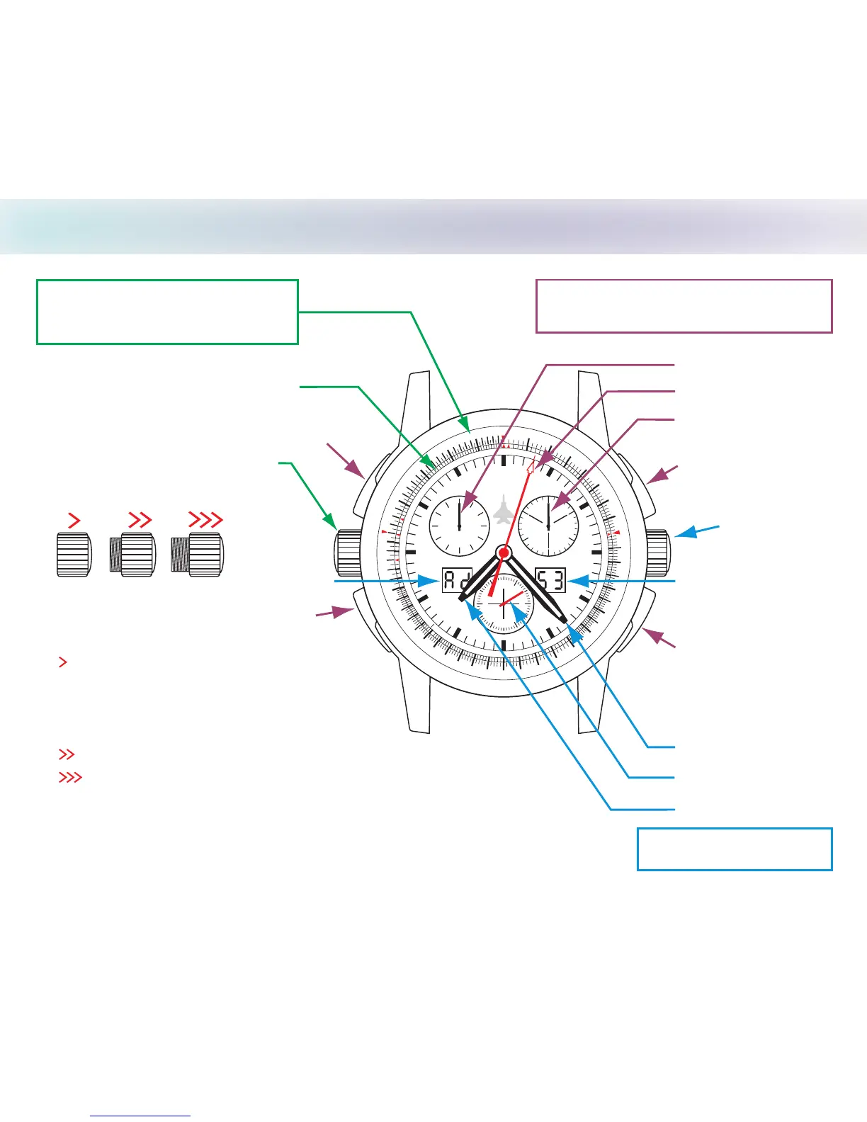 2 .Date, Time Zone, and LCD adjustment, Chronograph hands reset position