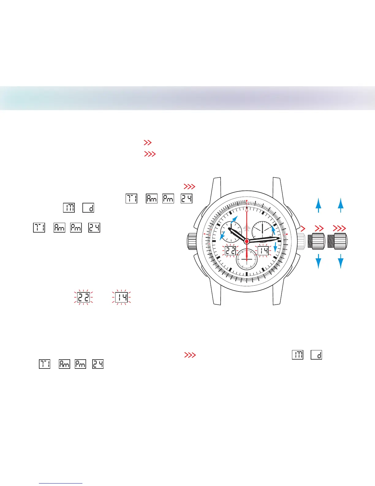 1. Pull setting crown out to position and preset the hour hand to the correct hour with the crown.