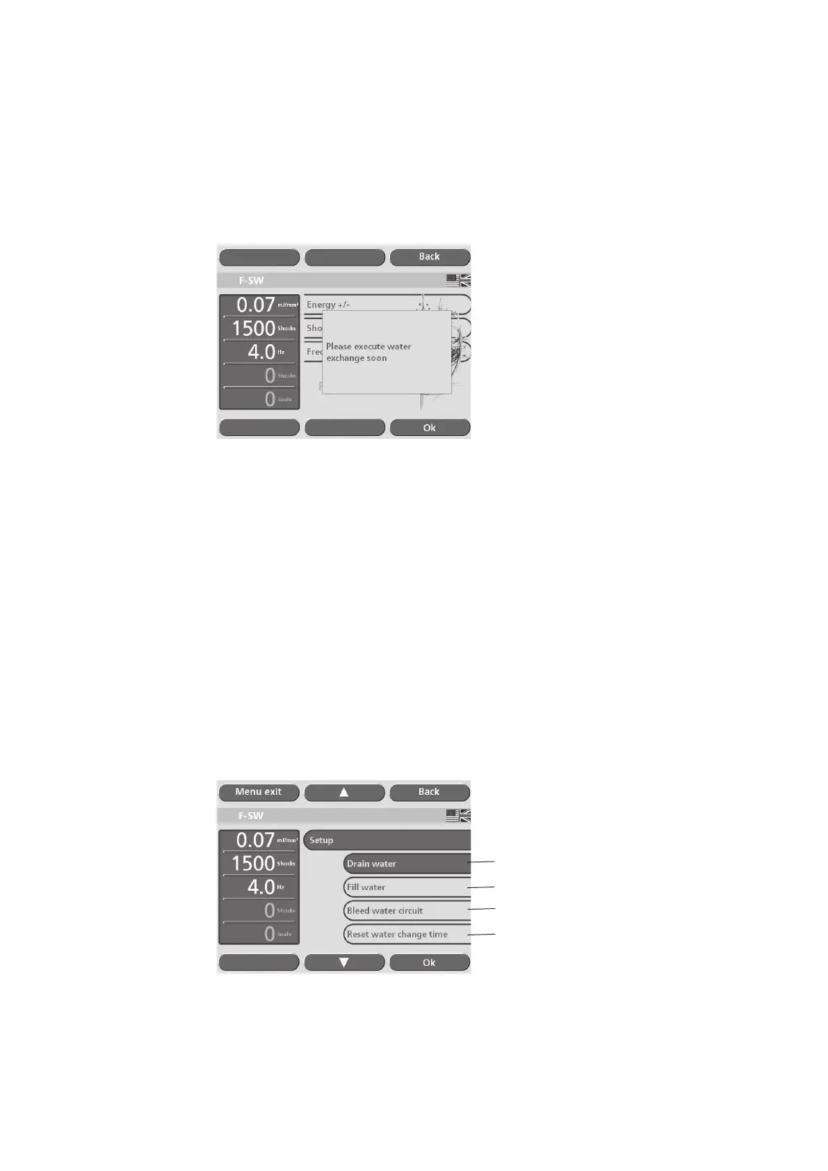 • Activate “Bleed water circuit” operating mode in the “Setup” menu (see picture