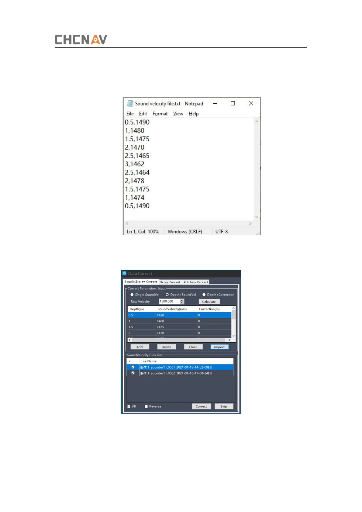 Import the sound velocity file via clicking [Import] button, the format should