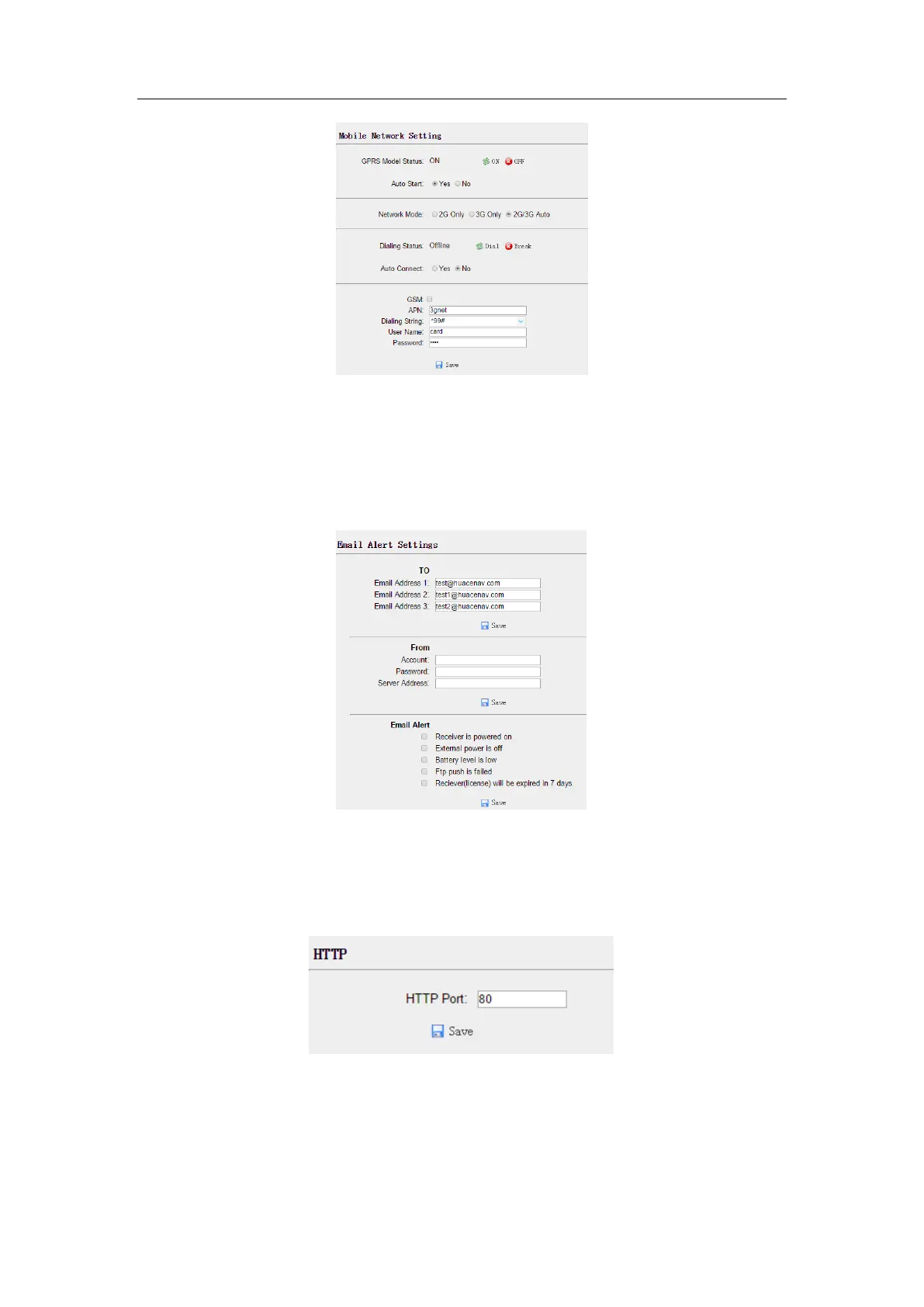 CHCNAV Huayi E91 - Email Alarm Submenu; HTTP Submenu