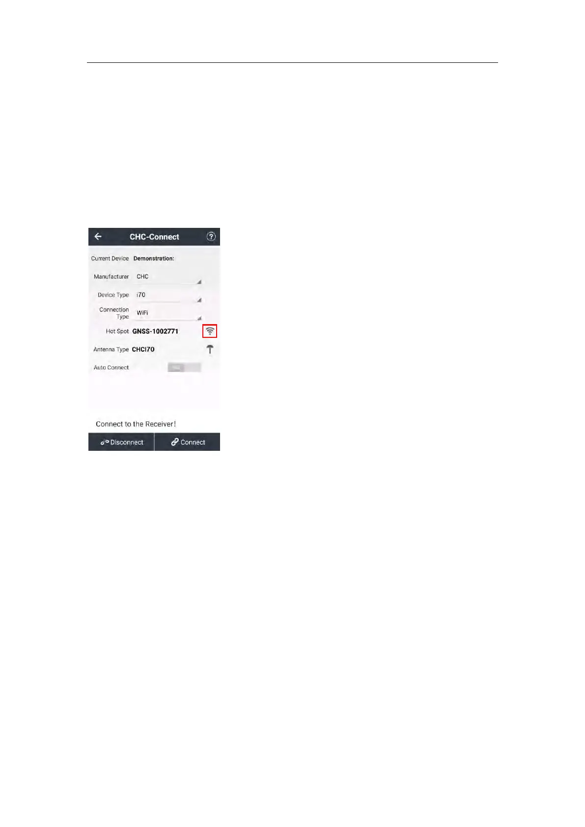 In the Connect screen, select CHC for the Manufacture field, i70+ for Device Type