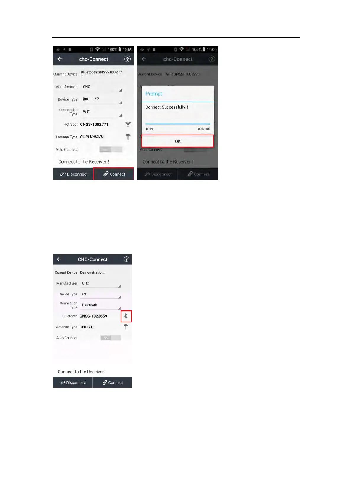 In the Connect screen, select CHC for the Manufacture field, i70+ for Device Type