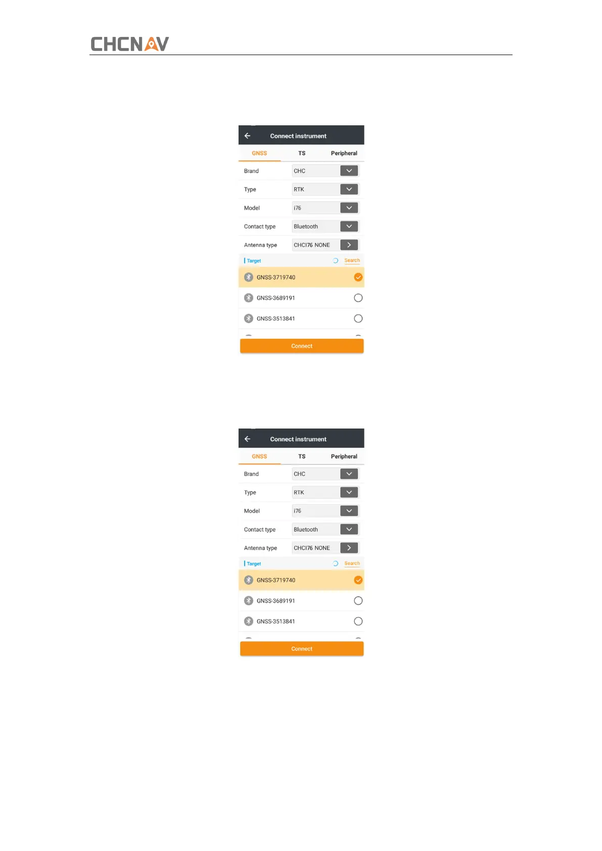 In the Connect screen, select CHC for the Manufacture field, i76 for Device Type field,