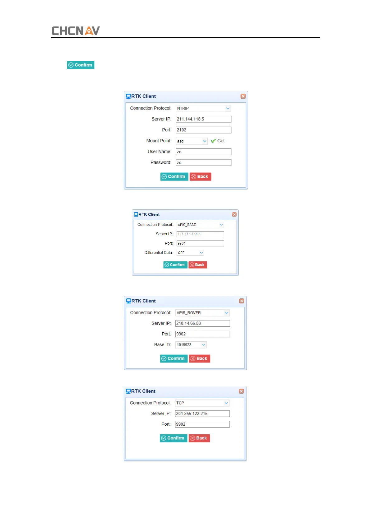 protocols among the NTRIP, APIS_BASE and APIS_ROVER → configure the related parameters→
