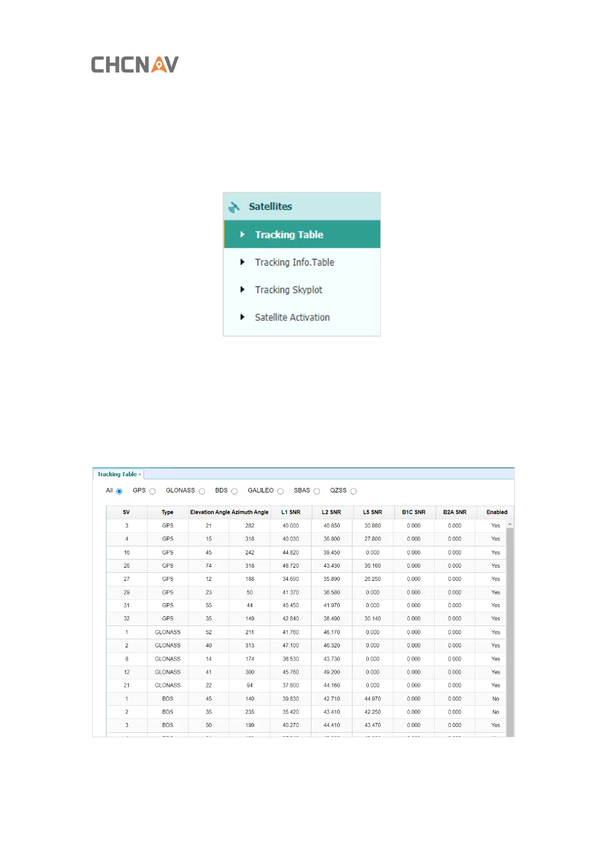 attitude angle, azimuth angle, L1 SNR, L2 SNR, L5 SNR and enable/disable status of each one.