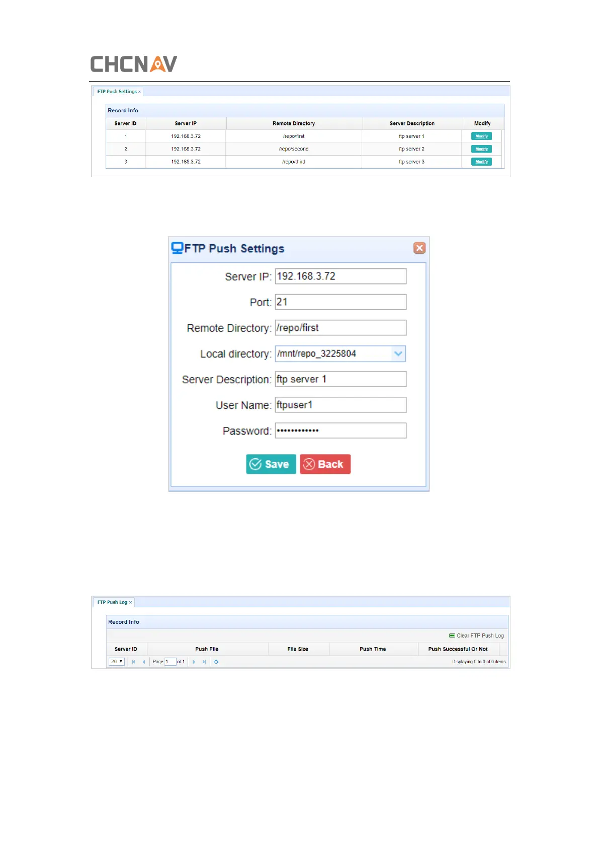 Tap Modify button on the right of the required FTP server and the FTP Push Settings screen