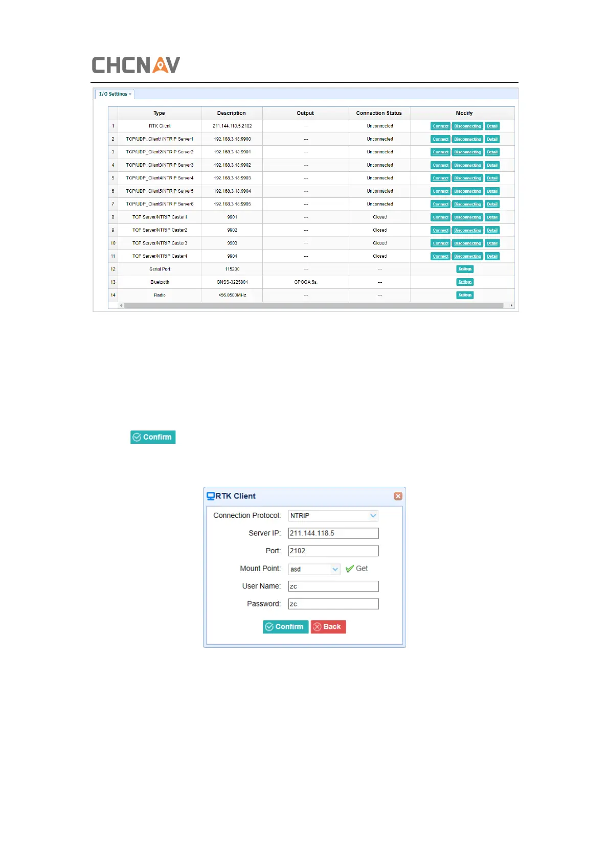 After configuring the settings of RTK client, users can log on CORS or APIS. Tap the Connect