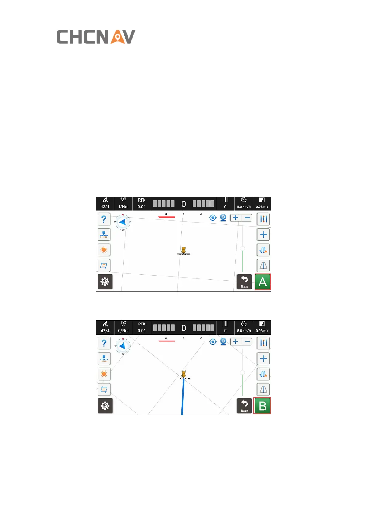 b) Drive to another end of the field and click B;