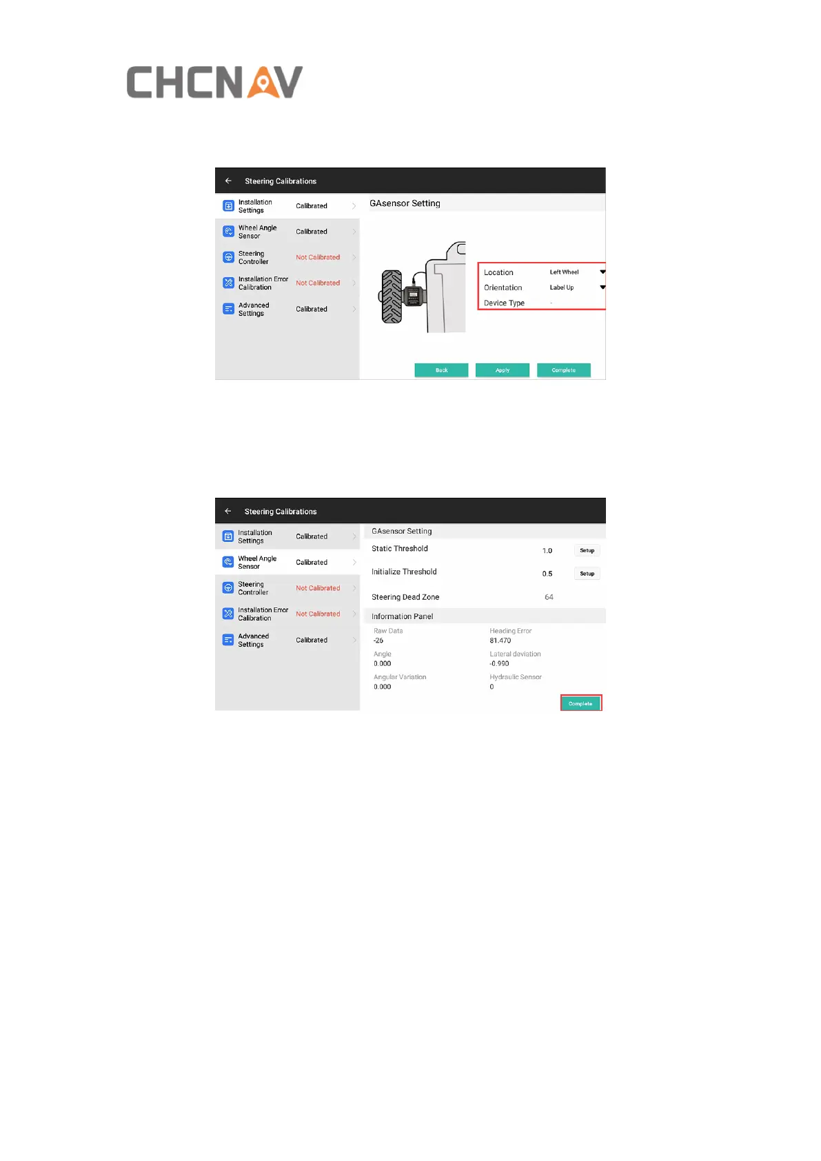 respectively. Click Complete to enter the Steering Controller calibration.