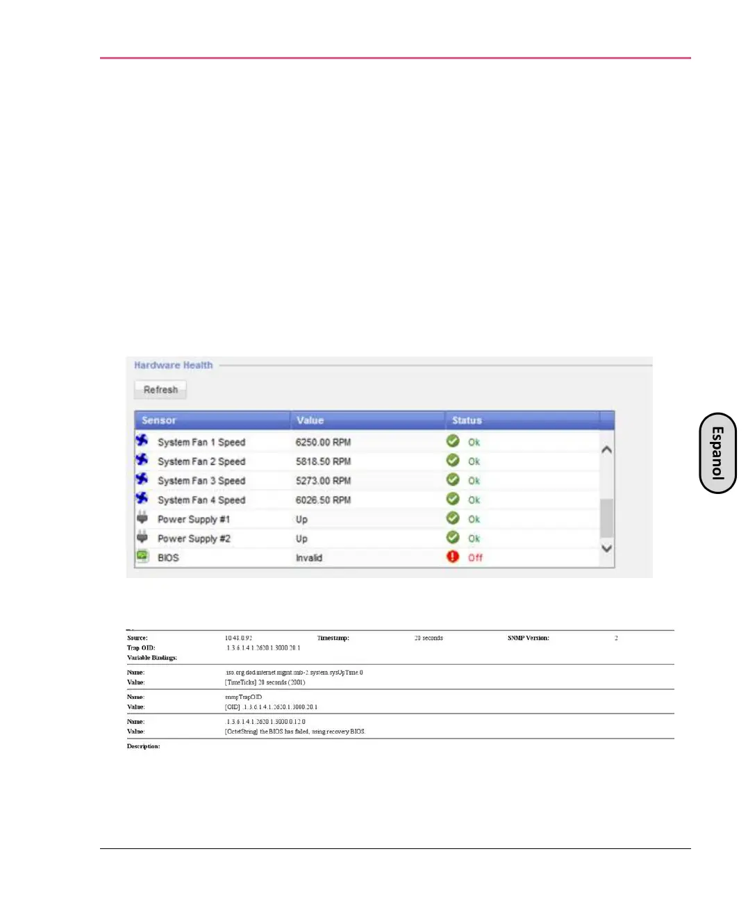 • Un mensaje de trampa SNMP (si la trampa biosFailure se configuró en la interfaz