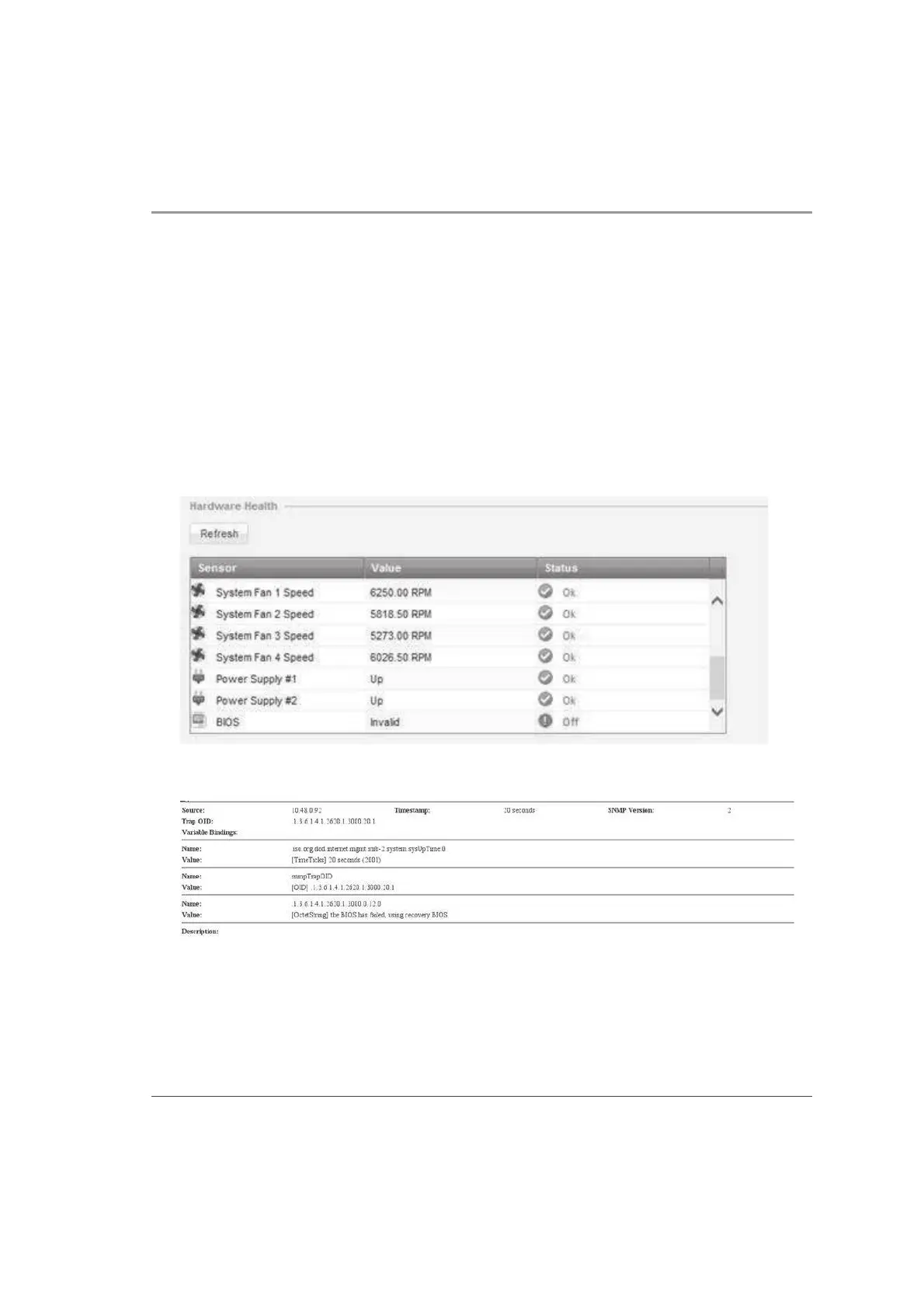 x An SNMP trap message (if the biosFailure trap was configured in the WebUI or