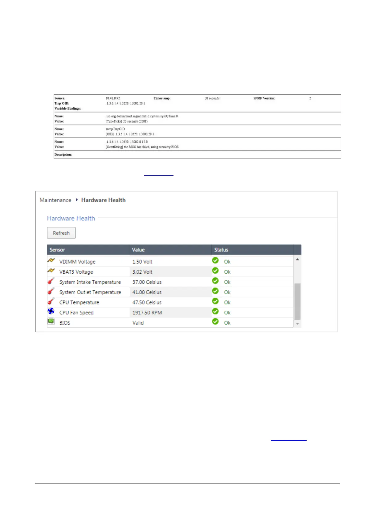An SNMP trap message (if the biosFailure trap was configured in the WebUI or through