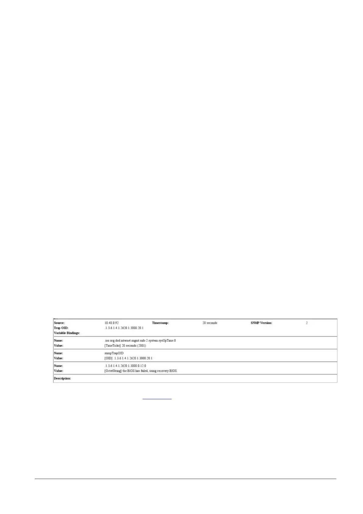 n An SNMP trap message (if the biosFailure trap was configured in the WebUI or through