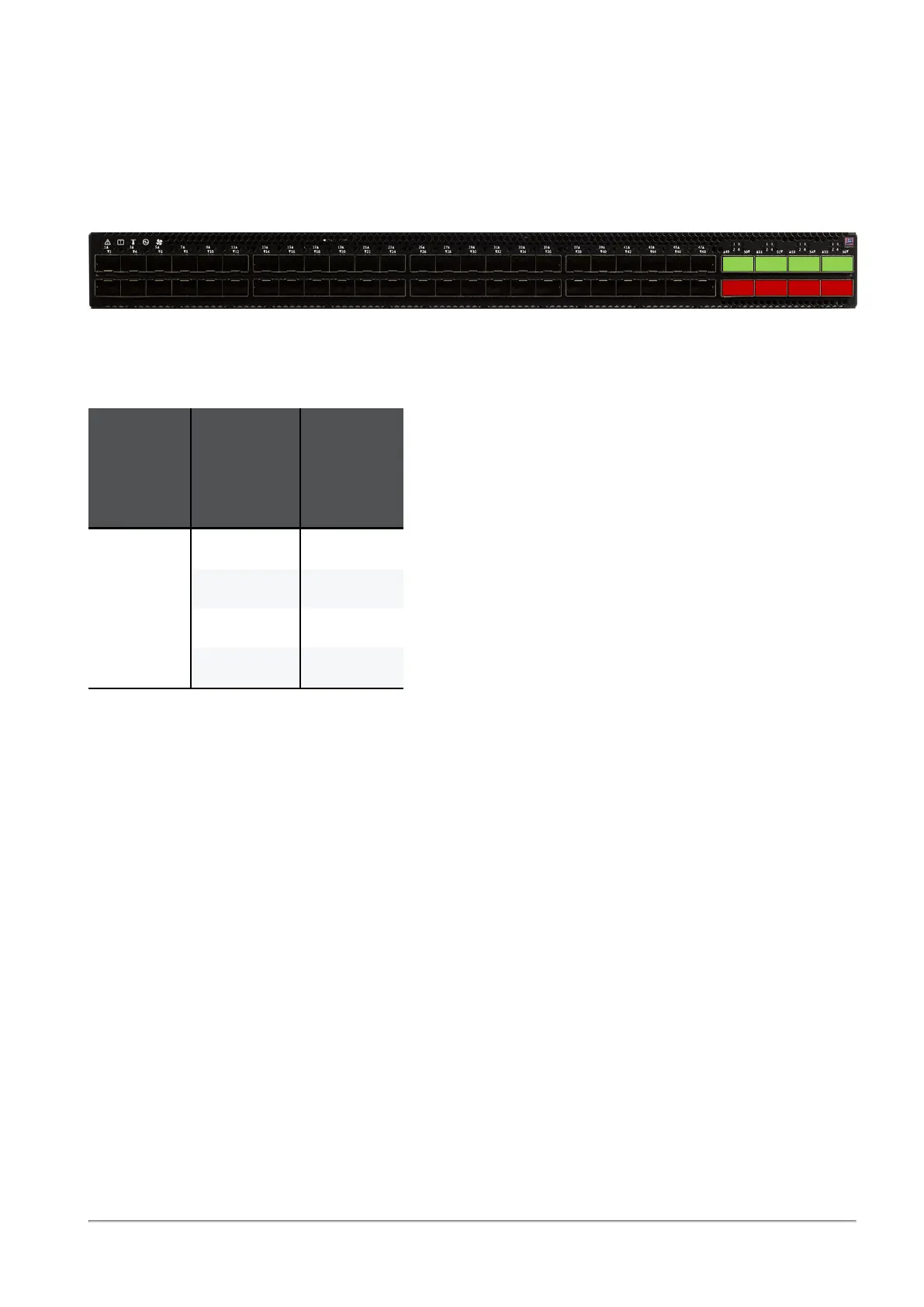 When the top ports (colored green) are in a split mode, the corresponding bottom QSFP28 ports 50, 52, 54,