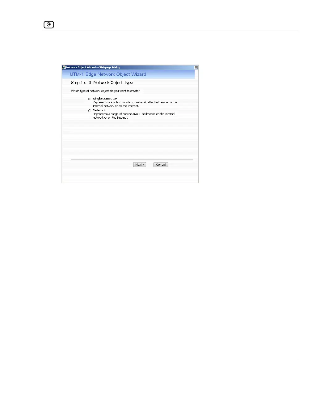 The UTM-1 Network Object Wizard opens, with the Step 1: Network Object Type dialog