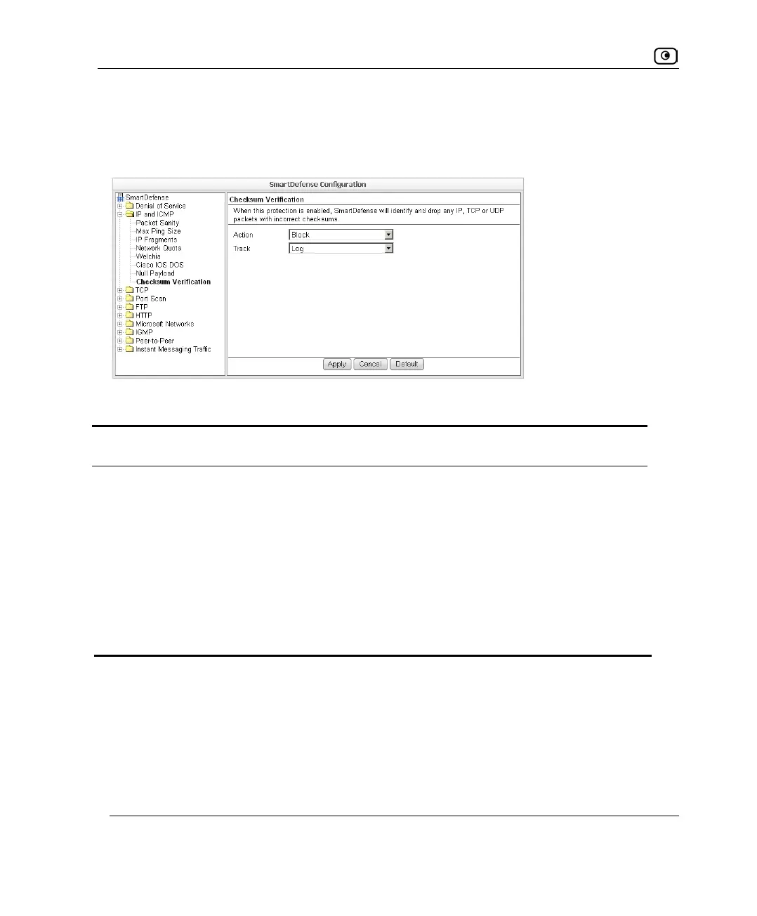 SmartDefense identifies any IP, TCP, or UDP packets with incorrect checksums. You can