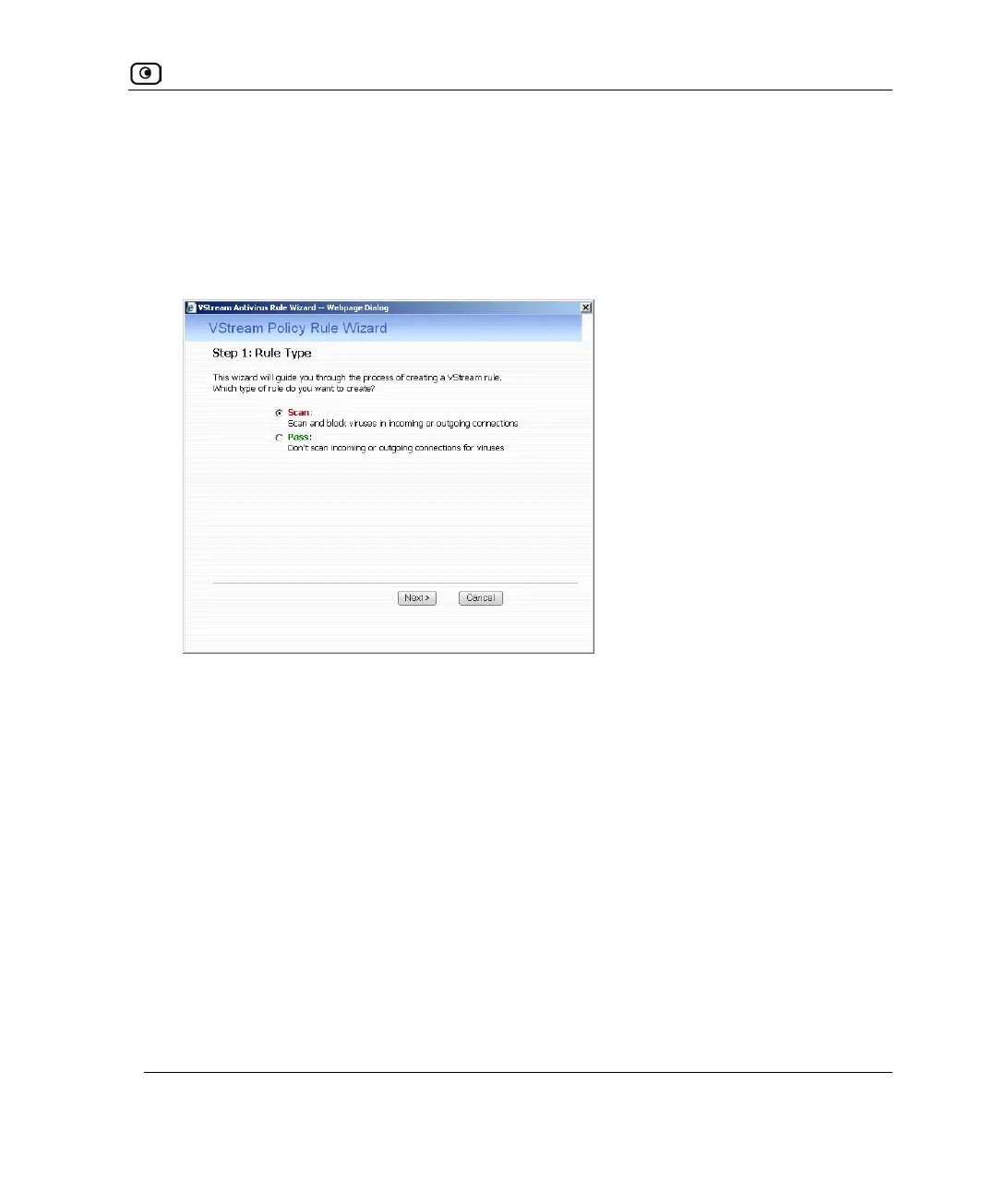 The VStream Policy Rule Wizard opens, with the Step 1: Rule Type dialog box