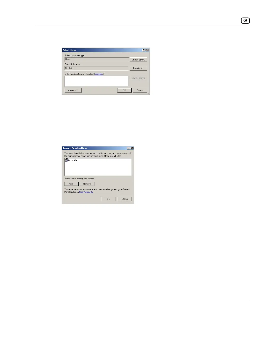 The Remote Desktop Users dialog box reappears with the desired user's username.
