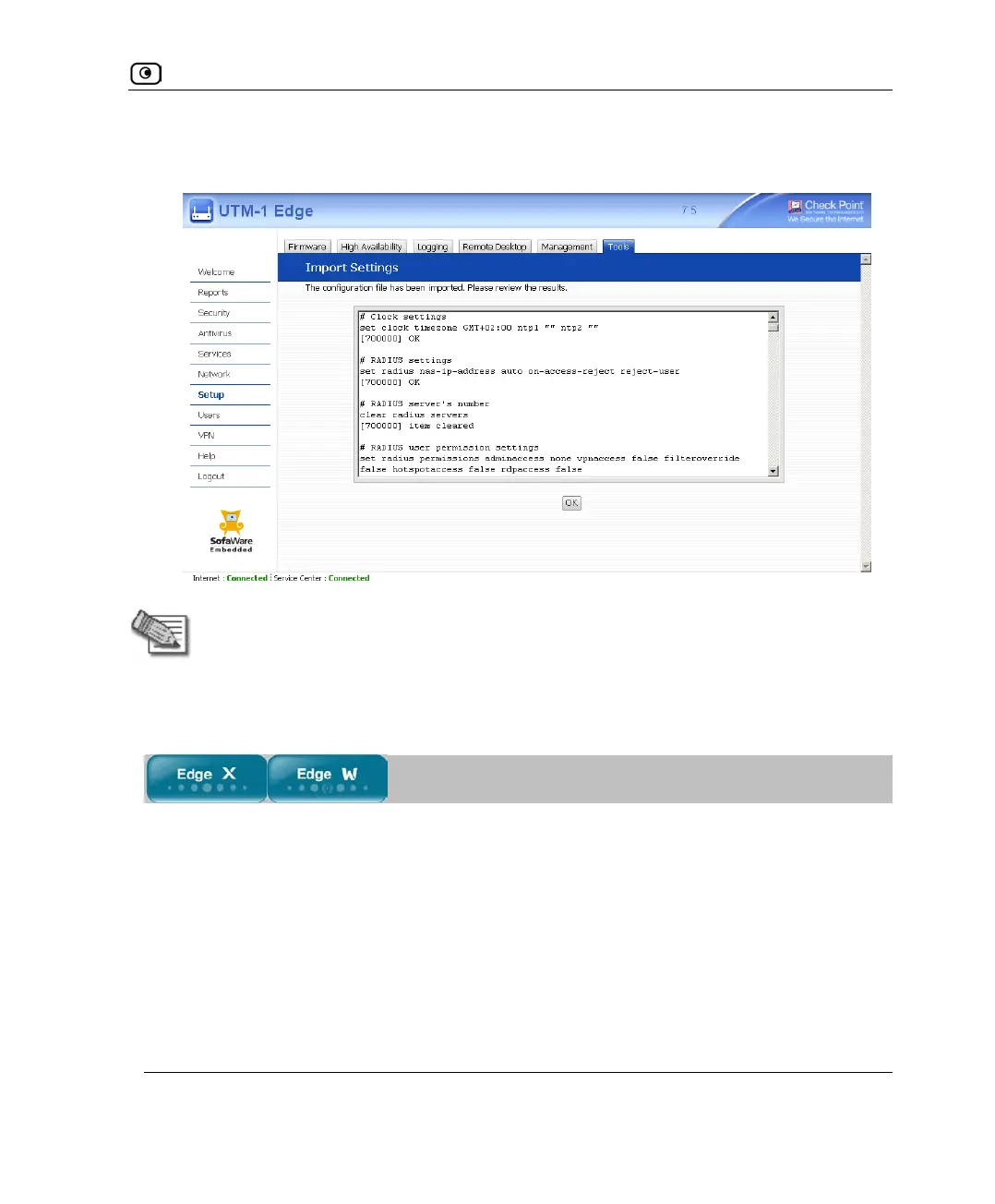 The Import Settings page displays the configuration file's content and the result of