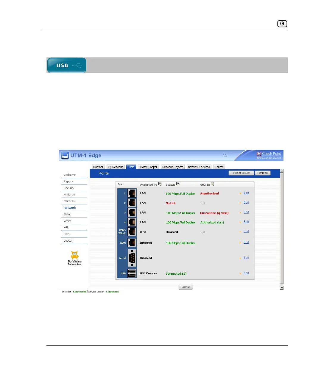 3. In the UTM-1 Portal, click Network in the main menu, and click the Ports tab.