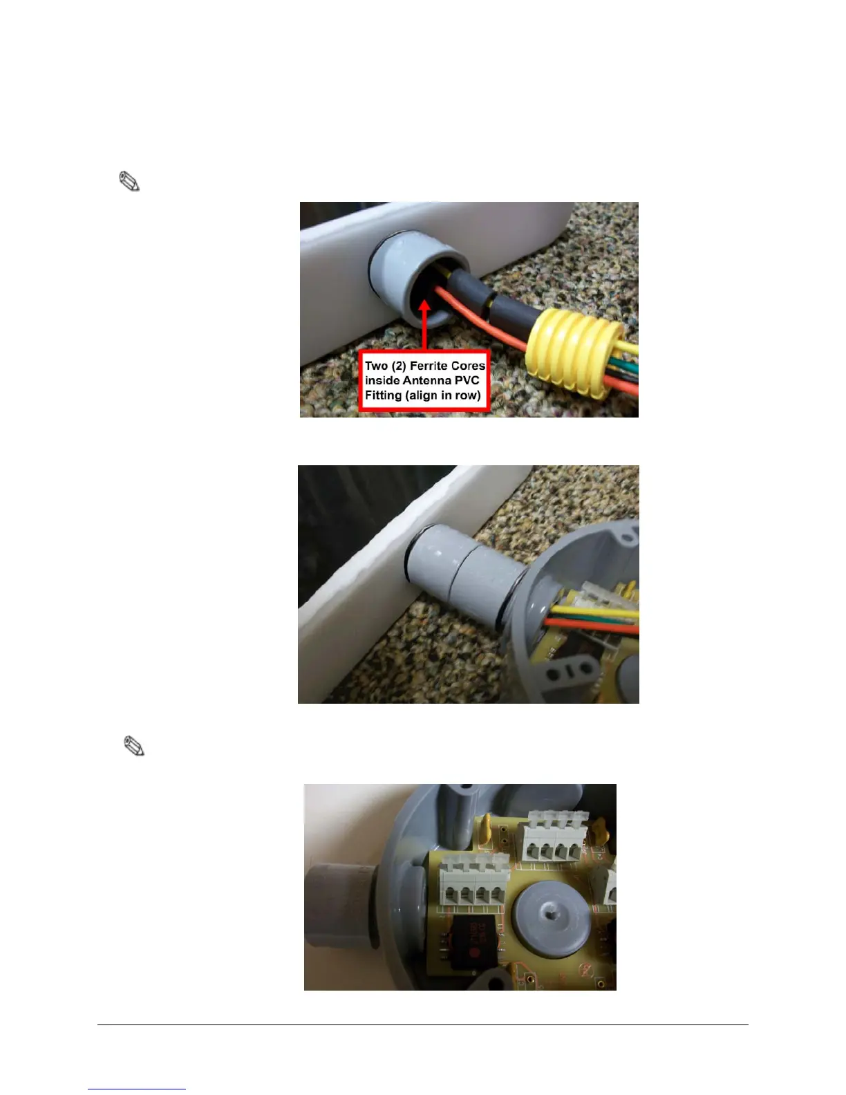 Thread the antenna wires through the piece of conduit. Push two (2) of the Ferrite cores into