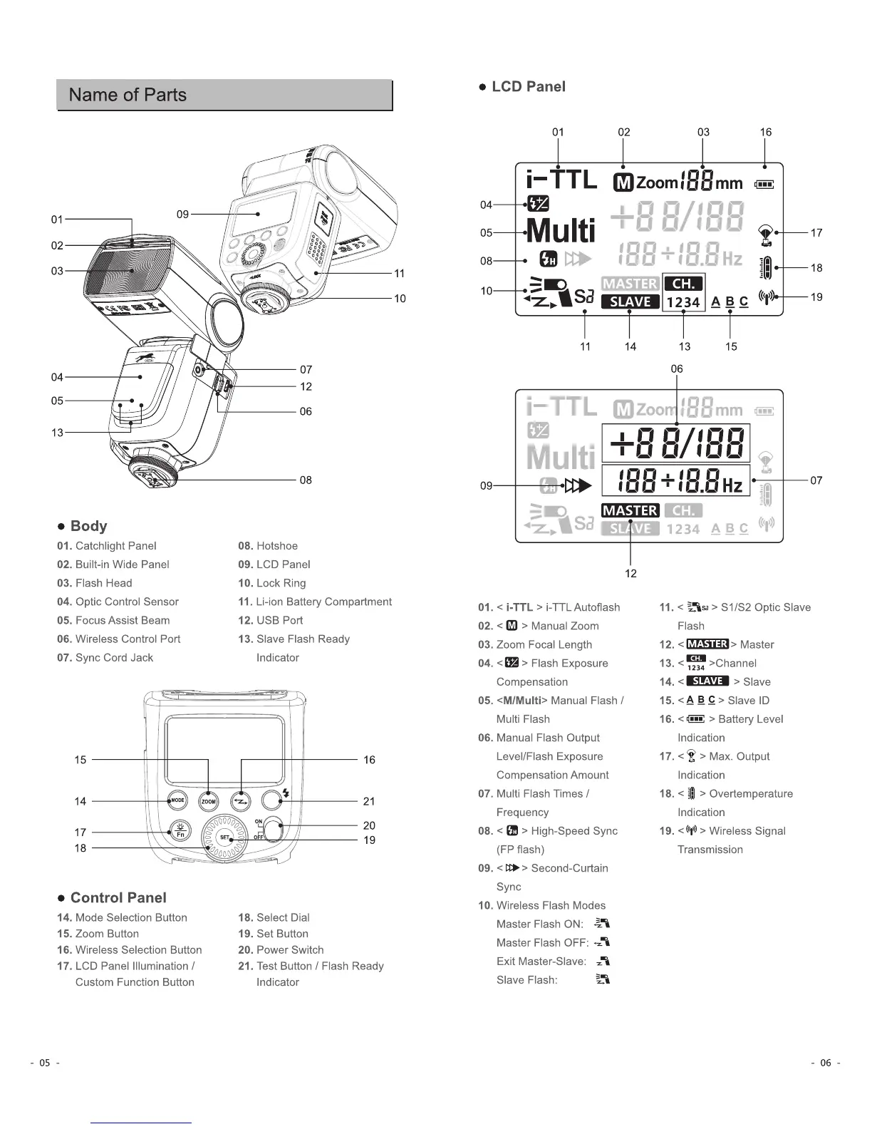 Cheetah V860 - Name of Parts; Body and Controls; LCD Panel Overview
