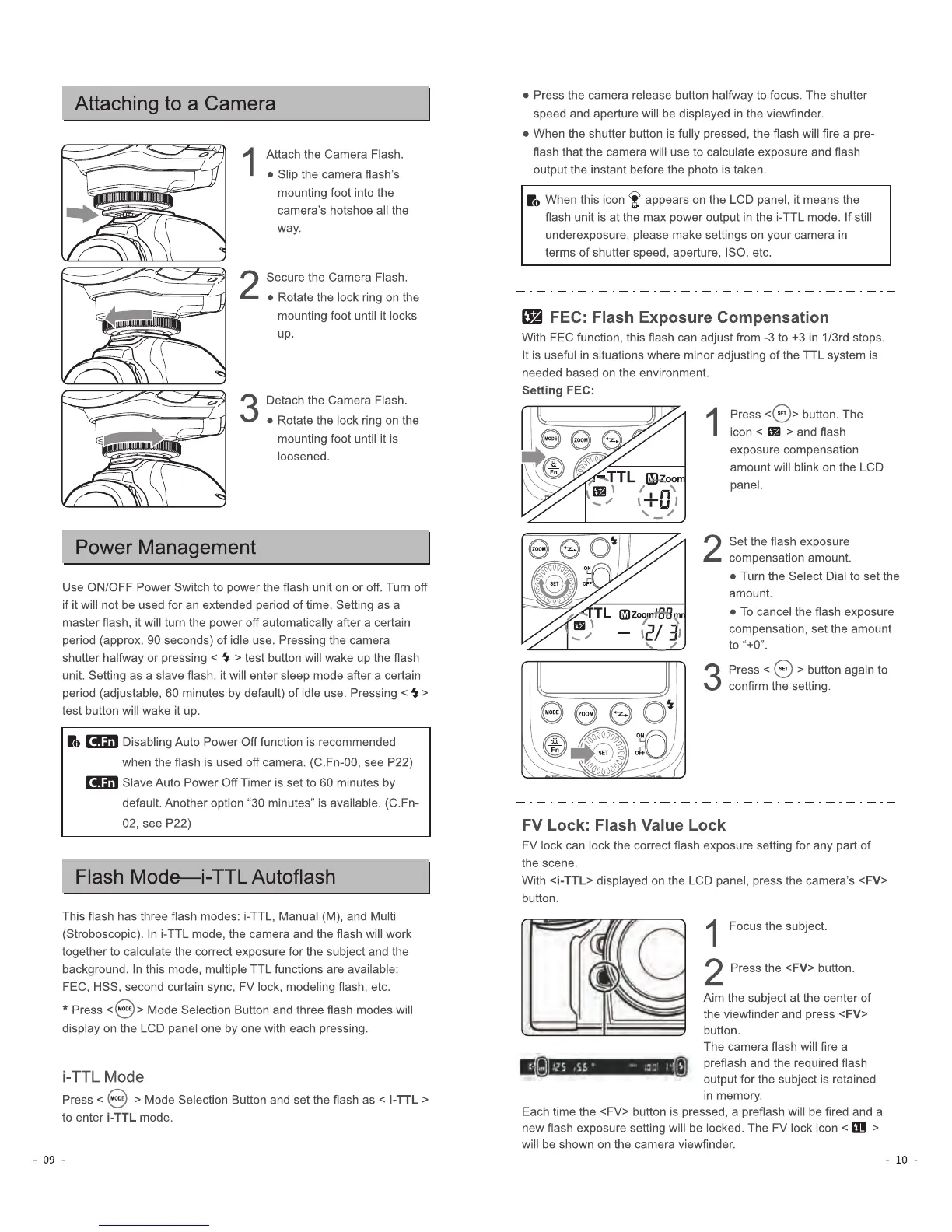 Cheetah V860 - Camera Attachment and Power; Attaching to Camera & Power Management; i-TTL Autoflash Mode; Exposure Compensation and FV Lock