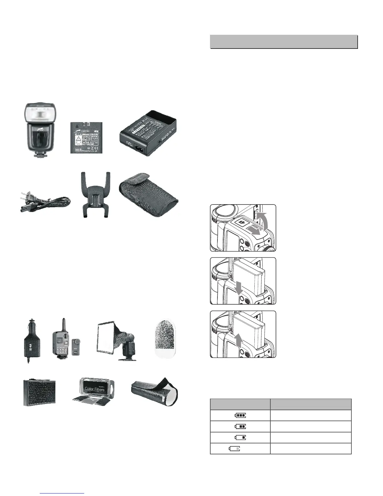 Flash unit 2. Li-ion Battery Pack 3. Battery Charger