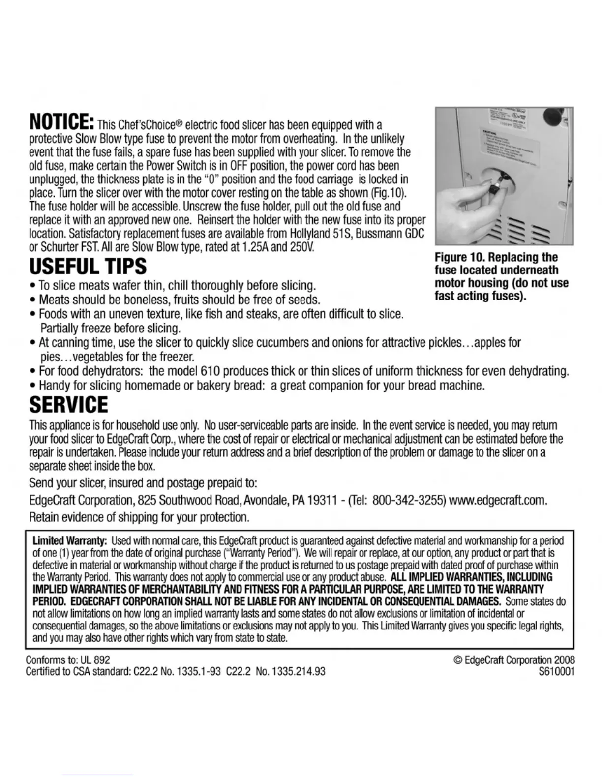Chef's Choice 610 - Service and Support; Fuse Replacement; Hints for Best Results; Service and Warranty Information