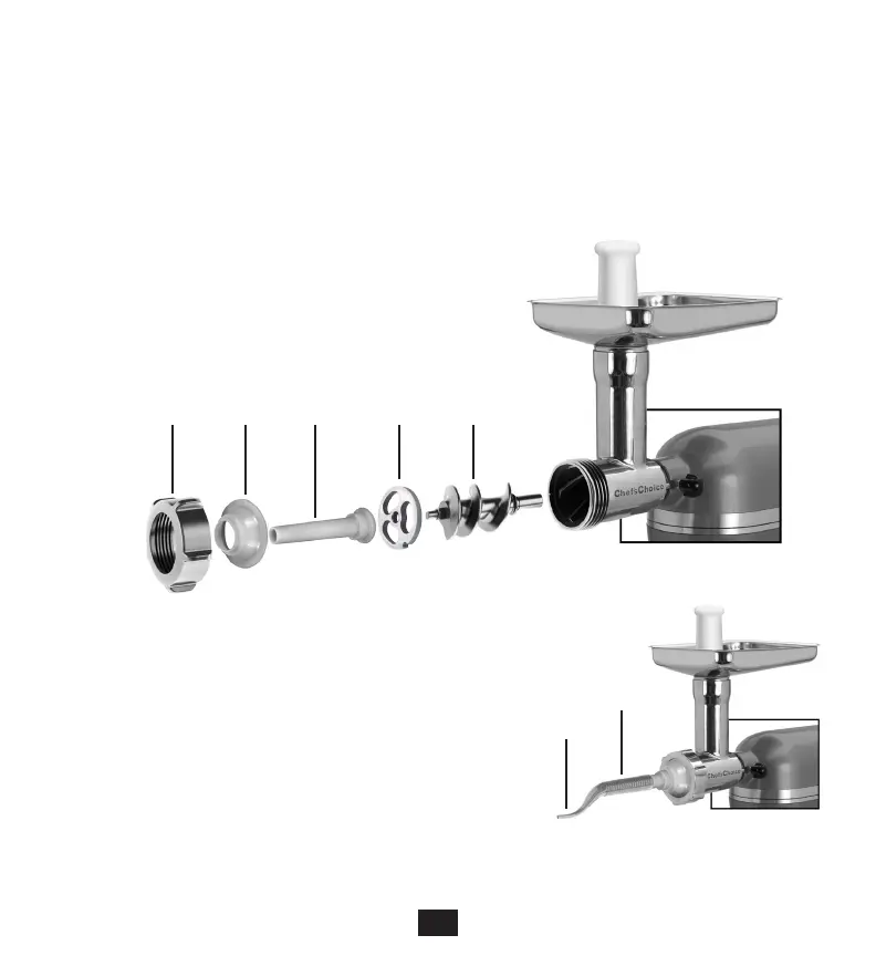 Make sure all grinder parts are in the correct position and properly secured (see “Installing Food Grinder Attachment to