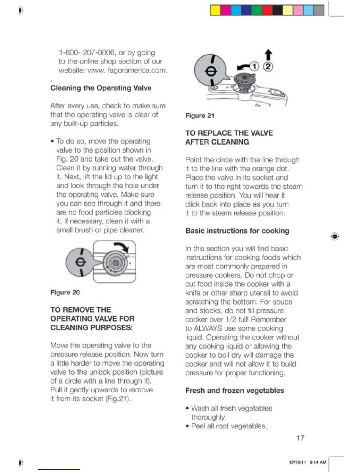 Chef Fagor - Cleaning the Operating Valve; Basic Instructions for Cooking; Fresh and Frozen Vegetables