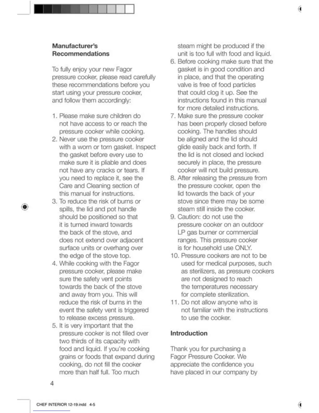 Chef Fagor - Manufacturers Recommendations; Introduction