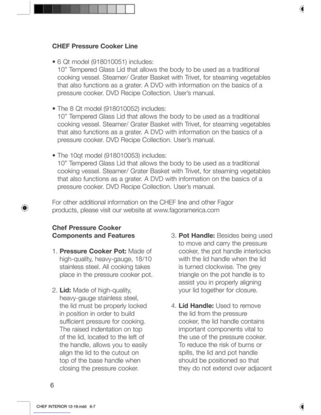 Chef Fagor - CHEF Pressure Cooker Line; Chef Pressure Cooker Components and Features; Pressure Cooker Pot; Lid
